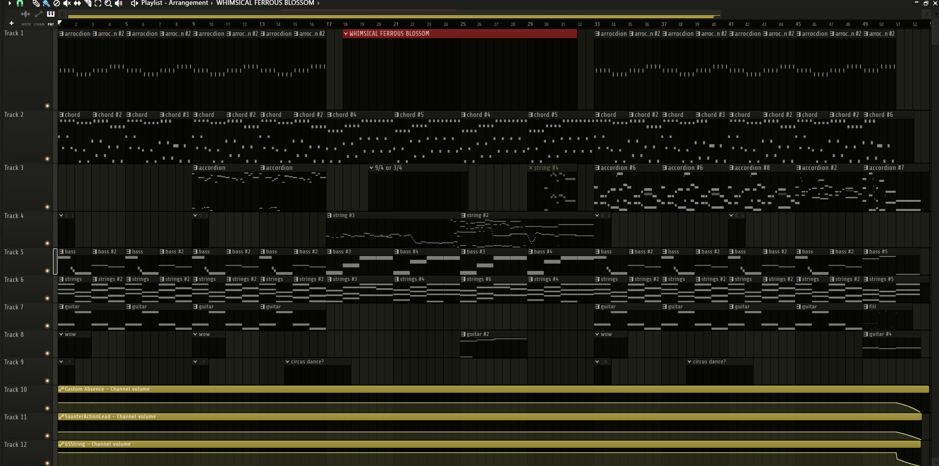 Whimsical Ferrous Blossom: This plays during the final dance against Dyson, reflecting Dyson's eccentric nature. Final boss theme. Combines motifs and ideas from the previous three tracks, particularly from Sunstolen Espionage, developing the progression further while bringing back some motifs. Tried to convey the idea of whimsy+frenzy for a frenzied dance with an odd opponent.